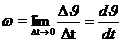 Dato un corpo rigido in rotazione attorno ad un asse, tale che, dopo un intervallo di tempo t esso abbia ruotato di un angolo , si definisce velocità angolare istantanea il limite per t 0 del rapporto tra la variazione dell'angolo di rotazione (espresso in radianti) e l'intervallo di tempo t (derivata dello spostamento angolare rispetto al tempo)