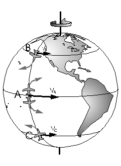 Allo stesso modo se l'aereo da A si alza in volo verso un punto C posto sullo stesso meridiano ma in direzione Sud nell'emisfero australe, esso si troverà ad essere più veloce dei punti che sorvola (VA > VC), precedendoli sempre in direzione Est. Ma in questo caso ciò equivale ad una deviazione verso sinistra del velivolo.