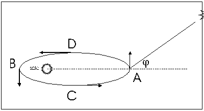 Prendiamo ora in considerazione una stella la cui direzione formi un angolo j con il piano dell'eclittica (j = latitudine eclitticale della stella). Possiamo facilmente osservare come la componente trasversale assuma i valori massimi in A e B, dove q v sin90° = v) ed i valori minimi in C e D, dove q j ( v sinj