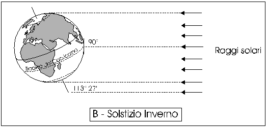 B) punto in cui è massima l'inclinazione dell'asse rispetto ai raggi solari (113° 27' = 90° + 23° 27'). L'emisfero australe è più esposto alla radiazione solare.