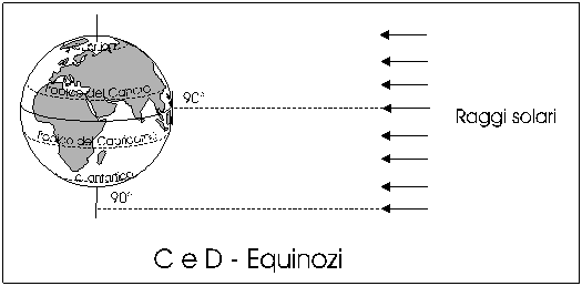 C) e D) punti intermedi in cui i raggi solari risultano a 90° rispetto all'asse terrestre. I due emisferi risultano egualmente esposti ai raggi solari.