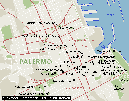 URBANISTICA E LUOGHI DI INTERESSE La città, il cui primo nucleo fenicio-romano fortificato si allungava, alle spalle della Cala, fino all'attuale Palazzo dei Normanni, mostra oggi nel centro storico la tipica tessitura urbanistica medievale di origine araba, a dedalo di stradette, attraversato dalle grandi arterie del periodo spagnolo: corso Vittorio Emanuele, sulla traccia dell'antico Càssaro (da Al-Qasr, castello) e via Maqueda, che si incrociano nei Quattro canti di città (piccolo slargo secentesco dagli angoli arrotondati). L'altra grande strada, via Roma, si deve a uno sventramento degli anni 1895-1922; ma già dalla seconda metà del Settecento il prolungamento di via Maqueda, voluto dai Borbone verso nord-ovest (via Ruggero VII) oltre la cinta spagnola delle mura poi abbattute, aveva individuato intorno ai Quattro canti di campagna (l'incrocio con via Mariano Stabile) la grande espansione ottocentesca della città, continuata poi, anche in altre direzioni, nel Novecento.