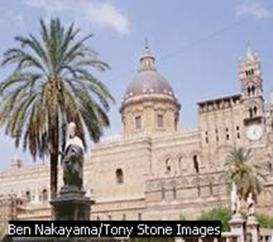 A Palermo non esistono vestigia dell'antichità e del periodo arabo, ma le numerose e magnifiche opere dell'epoca normanna mostrano notevoli interventi di artisti arabi. Tra queste, ricordiamo: il Palazzo dei Normanni, sorto nel XII secolo su un castello arabo e trasformato successivamente dagli spagnoli; la Cappella palatina (1130-1143), all'interno del Palazzo dei Normanni, ricca di mosaici di tradizione bizantina; San Giovanni degli Eremiti (1132) con forme arabe e chiostrino duecentesco; la Martorana (Santa Maria dell'Ammiraglio, 1143), con mosaici, un campanile del XII secolo e la facciata barocca, affiancata da San Cataldo (1160), con tre piccole cupole e merlatura araba; la Zisa, palazzo del XII secolo dai molti elementi arabi; e infine la parte absidale, normanna, della Cattedrale, edificio del XII secolo, ma rimaneggiato dal XIV al XIX (all'interno si trovano tombe imperiali e reali, degli anni 1197-1388, fra cui quella di Federico II). Tra gli altri edifici di grande interesse storico-artistico si segnalano la chiesa di San Francesco d'Assisi, costruita fra il 1255 e il 1277, successivamente modificata e ripristinata; il Palazzo Chiaramonte o Steri (1307-1380), della potente famiglia feudale; il Palazzo Abatellis (1490-1495), sede della Galleria regionale della Sicilia, e la chiesa di Santa Maria della Catena (XVI secolo), ambedue in forme prevalentemente gotico-catalane; la grandiosa fontana Pretoria (1555).