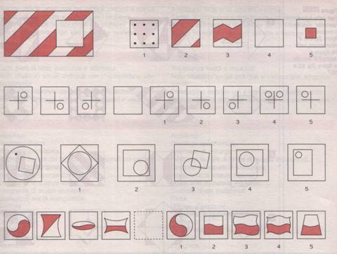 Seconda riga: quale dei 5 quadrati numerati completa la successione delle tre figure a sinistra?