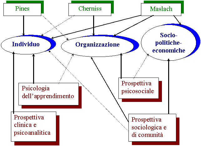 Con il blu si evidenziano le componenti che determinano il burnout, con il rosso le quattro prospettive esposte sopra e con il verde i modelli teorici principali approfonditi da alcuni autori. Lo spessore delle frecce indica quale sia la determinante più influente.