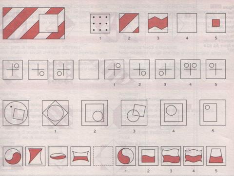 Seconda riga: quale dei 5 quadrati numerati completa la successione delle tre figure a sinistra?