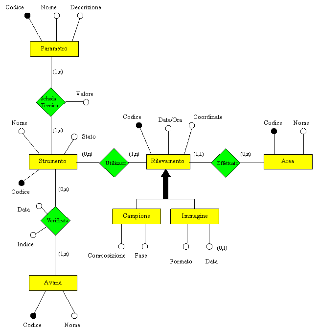 Un rilevamento può essere costituito dal prelievo di un campione oppure dalla registrazione di una immagine. Per quanto riguarda i campioni si vuole tenere traccia della loro composizione chimica e della fase in cui si trovano all'atto del prelievo. Per le immagini, si vuole tenere traccia del formato in cui è immagazzinata l'immagine e della data in cui (eventualmente) l'immagine è stata trasmessa a Terra. Ogni rilevamento è caratterizzato da un codice. Per ogni rilevamento si vuole tenere traccia della data e ora, delle coordinate, nonché dell'area in cui è stato effettuato. Ogni area è contrassegnata da un codice e da un nome simbolico. Ogni rilevamento è effettuato mediante uno degli strumenti a bordo. Ogni strumento è contraddistinto da un codice e da un nome simbolico, nonché da una breve scheda tecnica. Per ogni strumento si vuole tenere traccia delle eventuali avarie riscontrate. Per ognuna di esse si richiede di tenere traccia della data in cui si è verificata, del codice, del nome, dell'indice di gravità e dell'attuale stato (es. risolta).