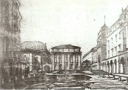 Nei primi disegni che Piacentini o il suo collaboratore, Oscar Prati, diffusero, la parete settentrionale della piazza era occupata da un edificio di significativo impegno architettonico, la cui facciata era completata da due archi che, sui fianchi del palazzo, chiudevano parzialmente le rispettive vie. Il palazzo si presentava con una serie di semicolonne incassate nella facciata, estese ai due piani previsti nel volume più esterno, che si sovrapponeva a un secondo, un poco più arretrato e sopravanzante l'altro di un piano. La fascia di tetto fra i due volumi era interrotta da statue che concludevano superiormente l'asse delle colonne, svettando sul frontone, come nel primo progetto della sede della Banca commerciale italiana, con la quale condivideva anche le colonne giganti.
