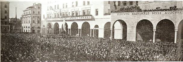"DAVANTI AGLI EDIFICI SUPERBI DI QUESTA PIAZZA CHE VOI AVETE DEDICATO ALLA VITTORIA E AGLI IMMORTALI SPIRITI CHE LA CONQUISTARONO, DAVANTI A QUESTA PIAZZA MONUMENTALE E AGLI ALTRI EDIFICI, LE PAROLE SONO SUPERFLUE, PERCHÉ PARLANO LE PAROLE, PARLANO I FATTI. QUELLO CHE VI È PIÙ CONFORTANTE IN QUESTO PERIODO E CHE RIVELA LA SPLENDIDA MATURITÀ DEL POPOLO ITALIANO, È CHE SI PUÒ PARLARE FRANCAMENTE ALLE MOLTITUDINI, DIRE AD ESSE CHE LA VIA NON È FACILE, AMMONIRLE CHE SARANNO NECESSARI ALTRI SACRIFICI, PERCHÉ SENZA SACRIFICI NON SI FA LA STORIA".