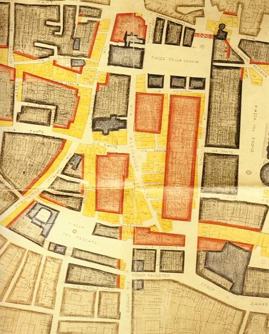 L'area del centro dopo la realizzazione del progetto: le parti in giallo sono le demolizioni, le parti in rosso le nuove edificazioni.