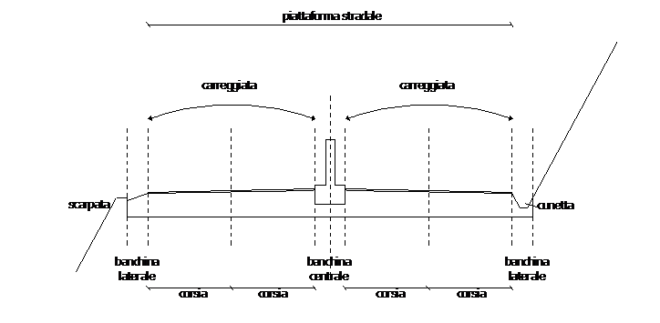 La piattaforma stradale è composta da più parti dette carreggiate, da banchine laterali e centrali (spartitraffico); ai lati ci sono le scarpate che collegano la piattaforma al terreno.