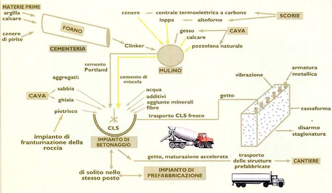 Le materie prime del cemento sono argilla e calcare, e poi c'è la cenere di pirite che non è una materia prima ma che ha il compito di abbassare la temperatura di cottura, per cui si spende meno per produrre il cemento.