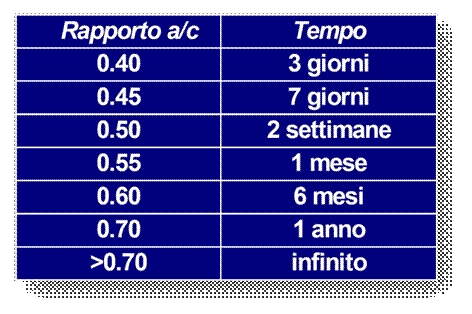 Lo schema che vediamo ci fa vedere che se usiamo un calcestruzzo con un rapporto acqua cemento di 0,40 allora tempo tre giorni che già i pori sono occlusi dalle fibre, se invece ho il rapporto acqua cemento di 0,5 dovrò attendere due settimane e così via, se arrivo a 0,7 allora la porosità non si occluderà mai.