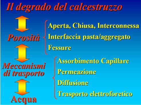 Il degrado del calcestruzzo passa sempre attraverso la presenza di acqua. Se non ci fosse l'acqua il calcestruzzo non si degraderebbe. L'acqua è l'elemento fondamentale. Siccome la presenza di acqua nel calcestruzzo è fondamentale è una condizione necessaria ma non sufficiente per il degrado. Se non c'è acqua non avviene nulla. Se c'è acqua potrebbe non avvenire nulla ma se insieme all'acqua c'è il cloruro o il solfato il degrado avviene. È importante cmq la sua presenza nel calcestruzzo.