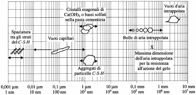 Vediamo ora come possono essere le dimensioni dei pori; misure importanti se teniamo conto del fatto che la risalita capillare dipende dalla dimensione dei pori [I più piccolini sono i pori del gel del CSH, non ci interessano perché sono troppo piccoli]. I pori che ci interessano sono i vuoti capillari, cioè sono quelli attraverso i quali sale l'acqua (e con l'acqua tutti i vari cloruri etc.) e sono dell'ordine di 0,1 micron (da 0,01 a 1 micron). Poi ci sono delle bolle di aria intrappolata, introdotte con gli additivi areanti, dell'ordine di 0,1-0,3 mm e sono detti 'macropori'. Sono quelli che servono per sfogare le sovrappressioni create dall'acqua che diventa ghiaccio (che necessità di sfogo). Poi ci sono i vuoti d'aria che si creano per una cattiva lavorabilità dell'impasto: si creano se l'impasto non viene ben vibrato e danno enormi problemi alla resistenza meccanica. (è inutile che uso rapporti acqua/cemento bassi se poi non riesco a mettere in opera; con un rapporto acqua/cemento basso riduco i pori capillari ma se non vibro mi danneggia con i vuoti d'aria).
