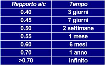 Un cemento impermeabile è quello che dopo 28 giorni ha un rapporto acqua/cemento < o = a 0,55. Se il rapporto è più basso si raggiunge prima. Quando questo rapporto supera 0,70 vuol dire che questo calcestruzzo non raggiungerà mai l'impermeabilità ed è vulnerabile agli agenti di degrado.