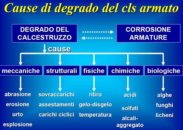 A parte le cause meccaniche e strutturali, tutte le altre dipendono tutte dall'acqua. Quando si parla di calcestruzzo armato, oltre al degrado del calcestruzzo c'è da stare attenti alla corrosione delle armature. Le cause del degrado del calcestruzzo sono tante: meccaniche (abrasione, erosione, urto, esplosione) e strutturali (sovraccarichi, assestamenti del terreno, carichi ciclici (daglie oggi e daglie domani)). [es a Foggia l'edificio è andato giù perché: eliminato 1 pilastro - rapporto acqua/cemento = 1]. Altre cause di degrado sono le cause fisiche: ritiro (contrazione del volume del calcestruzzo per effetto della evaporazione dell'acqua), disgelo e gelo e temperatura.