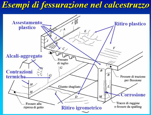 Possiamo avere fessure per ritiro igrometrico, fessure per contrazione termica, fessure di trazione per flessione, fessure da ritiro plastico (che possono esserci poche ore dopo il getto quando ancora non ha fatto presa), fessure da assestamento plastico (assestamento del terreno), fessurazione da alcali-aggregato. Le fessure da ritiro igrometrico sono le più diffuse: di per sé il ritiro non è un problema (un millimetro di ritiro del calcestruzzo non mi fa la differenza) se non fosse che per il fatto che se il cls è vincolato rischio una fessura. Se non è vincolato e si ritira non mi importa nulla. [Per la fessurazione delle dighe è necessario abbassare il dosaggio di cemento e usare cementi ricchi in pozzolana perché reagendo più tardi sviluppa calore in momenti successivi e ne accumula di meno (non usare cementi ricchi di 'C3A' che produce calore). L'azione del gelo e disgelo provoca la disgregazione del materiale e espulsione della parte corticale portando l'armatura a vista, non è devastane ma rovina gli strati superficiali e venendo a mancare il copriferro ne consegue che si possano corrodere le armature.