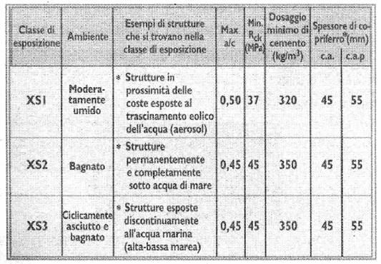 [Per quanto riguarda la presenza di cloruro di mare, classe XS, la situazione peggiore è quella (più cresce il numero più è gravosa la situazione) XS3 di un ambiente ciclicamente bagnato e asciutto, perché se la struttura fosse sempre bagnata non ci arriverebbe facilmente l'ossigeno]. Con la norma EN206 di fronte ad una certa condizione devo capire la struttura in quale di queste classi la faccio ricadere e, scelta la classe, all'interno ci sono le precauzioni per condizioni più o meno gravose per l'umidità. La norma mi dice qual è il rapporto/acqua cemento massimo, qual è il dosaggio di cemento minimo, qual è la classe di resistenza del cls minima e anche il copri ferro minimo.