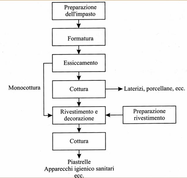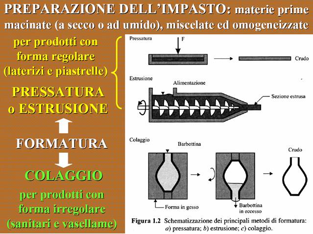 es. tramite pressatura in delle forme pronte, o per estrusione e poi tagliata. il colaggio viene usato più per i prodotti artigianali, come si produce? C'è una forma in gesso, vi viene colato il materiale dentro, poi il materiale viene assorbito dal gesso così che si essicca solo la parte a contatto col gesso, dopo un po' si rovescia ed esce fuori tutto quello non ancora essiccato, e si ottengono per esempio i vasi, le anfore