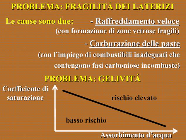 altro problema è la GELIVITA', per i laterizi che vanno a contatto con l'atmosfera; c'è una prova per verificare la gelività del materiale, più il materiale è poroso e più riesce ad assorbire l'espansione delle particelle del materiale.. un trucco è proteggerli dall'azione dell'acqua è usare materiali con basso un assorbimento di acqua.