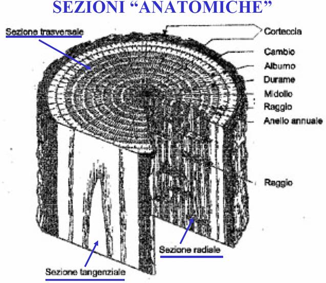 La zona centrale è il midollo scarsamente resistente, andando verso l'esterno incontriamo i primi anelli detti durame che è una zona morta dove non passano le sostanze nutrienti, ha solo una funzione statica, poi c'è l'alburno che è fatto dalle altre fibre ove passano invece le sostanze nutritive.