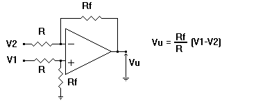 Questo dispositivo produce un'uscita proporzionale alla differenza dei due ingressi V1 e V2. La tensione di uscita č uguale alla differenza V1-V2 moltiplicato il guadagno del circuito, che nel nostro caso vale Rf/R.