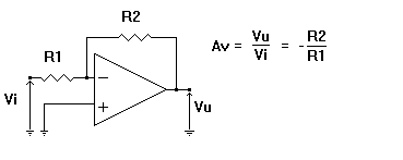 Questa configurazione è detta invertente e differisce dalla precedente perché il segnale di uscita (Vu) risulta sfasato di 180° rispetto al segnale di ingresso, e lo dimostra anche il segno meno davanti all'espressione del guadagno.