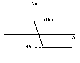 Il guadagno di questa configurazione è minore di 'zero' che è intuibile anche dal fatto che il segnale di ingresso è applicato al terminale invertente, e, come nell'altra configurazione, dipende solo dal valore delle due resistenze R2 e R1. Il tratto lineare come nell'altra configurazione ha la pendenza che dipende dal guadagno.