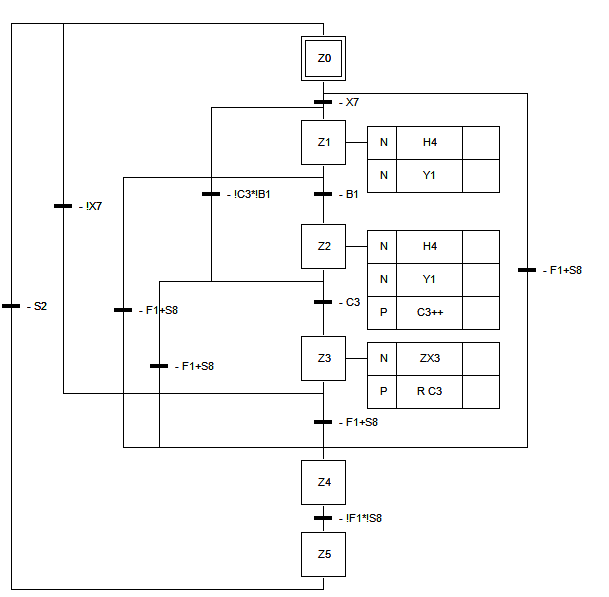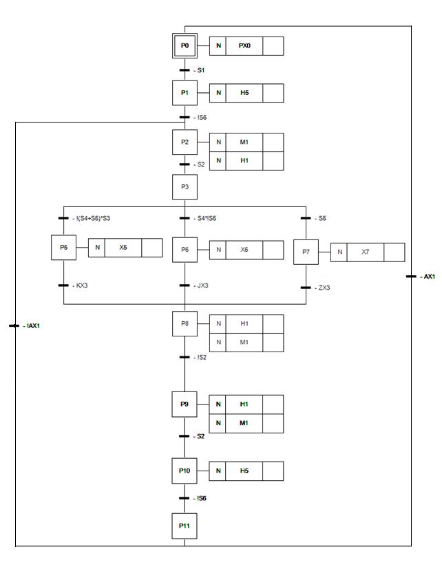 La fase iniziale è la P0 cui è stata assegnata l'azione PX0 per avviare l'SFC per il controllo di arresto a fine ciclo; segue la transizione con controllo su S1, pulsante di attivazione dell'impianto.
