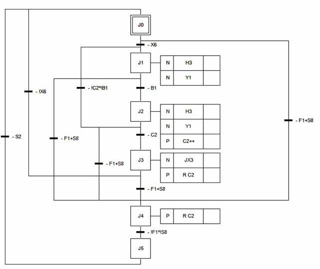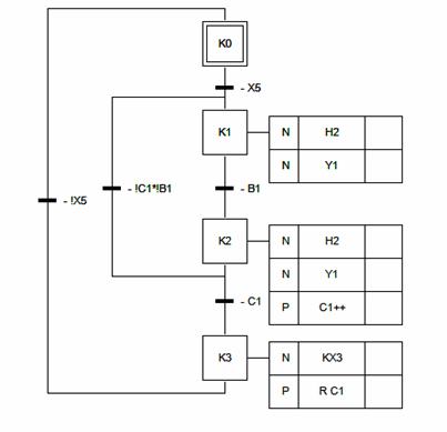 La fase K1 si attiva solo se è vera la variabile X5; in tal caso si accende la lampada H2 e, apertasi la valvola Y1, la pastiglia finisce nel barattolo. Si passa alla fase K2 solo quando la pastiglia ha attraversato la fotocellula (B1=1). In questa fase si accende la lampada H2, si apre la valvola Y1 ed il contatore C1 viene incrementato di una unità fintanto che il valore del conteggio non arriva a 3. Quando la transizione C1 diventa superabile, si arriva alla fase K3 dove si resetta il contatore C1 e viene alzata la variabile KX3.