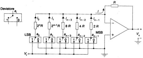 Il deviatore permette di collegare la resistenza a terra, nel caso di bit 0, o al morsetto invertente dell'amplificatore operazionale, se il bit vale 1.