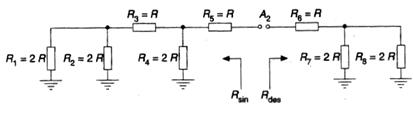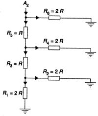 La rete di resistenze è tale che da ogni nodo Ai la resistenza vista verso destra e verso sinistra vale sempre 2R. In figura 3 è riportato l'esempio del nodo A2 (i generatori sono cortocircuitati).