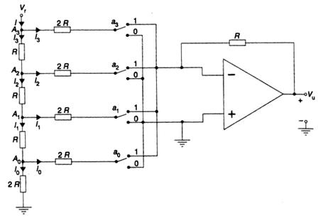 Ad esempio nel caso si DAC a 4 bit: (a3a2a1a0) al bit a3 associamo una resistenza 2R (R è il valore presente nel convertitore corrente/tensione), al bit a2 colleghiamo una resistenza doppia della prima 4R, ad a1 la resistenza 8R ed infine ad a0 la resistenza 16R.