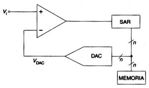 Lo schema circuitale è riportato in figura 17. Il funzionamento si basa sull'utilizzo di un particolare circuito sequenziale denominato SAR (Successive Approximation Register). Questo dispositivo genera una parola di codice che viene corretta, dopo il confronto tra il campione Vi da convertire e la tensione VDAC in uscita dal DAC, fino a quando la differenza risulta minore di un valore fissato.