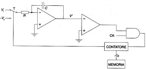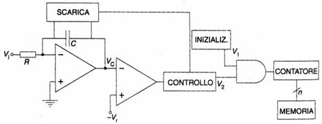 I convertitori ad integrazione più diffusi sono quelli a doppia rampa. Lo schema di funzionamento, riportato in figura 19, evidenzia la presenza del circuito integratore. Questo produce in uscita una rampa decrescente (o crescente) se l'ingresso è una costante positiva (o negativa).