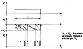 Il valore della tensione d'ingresso è stato convertito in frequenza. Infatti il tempo impiegato dalla rampa per raggiungere -Vr dipende da Vi e quindi il numero di impulsi contati durante il tempo T è legato al valore del campione. Possiamo così associare a Vi la parola binaria fornita dal contatore.