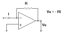La tensione Vu è proporzionale alla corrente che entra dal terminale (-), tramite il fattore R, che può essere scelto a piacere. Il segno meno compare perchè viene usato l'ingresso invertente, se non lo si desidera basta invertire il verso della corrente di ingresso. Il risultato è facilmente dimostrabile osservando che la Vu misurata tra il terminale di uscita e massa la si può pensare applicata tra uscita e il terminale (-) grazie al corto circuito virtuale, ma per la legge di ohm questa è di verso opposto alla ddp sulla R causata dalla I.