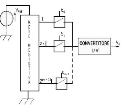 Il circuito è composto da una rete di resistenze, da un convertitore corrente/tensione realizzato con un amplificatore operazionale e da alcuni deviatori elettronici. I deviatori sono utili nel nostro caso per descrivere il comportamento del circuito in quanto simulano una rete digitale che fornisce in uscita i livelli di tensione alti e bassi (corrispondenti ai valori logici 1 e 0). Il numero di resistenze e di deviatori è pari alla risoluzione del DAC. Il deviatore consente di collegare la resistenza a massa se il bit vale 0 o al potenziale di riferimento Vfs se il bit vale 1. Di conseguenza in ogni resistenza c'è un passaggio di corrente soltanto se il bit associato vale 1 in modo da avere una differenza di potenziale pari a Vfs ai capi della stessa resistenza. In caso di bit 0 i due morsetti della resistenza sono a massa e quindi non ci può essere passaggio di corrente. La corrente che circola in ogni resistenza deve essere tale da dare ad ogni bit il proprio peso in funzione della sua posizione, secondo il principio della conversione. Il valore della corrente deve essere maggiore per il bit più significativo (MSB) per poi diminuire per i bit meno significativi. Si procede dunque collegando al MSB la resistenza minore e raddoppiandone il valore per il bit successivo fino al LSB per il quale la resistenza è 2n-1 volte maggiore rispetto alla prima. Il convertitore corrente - tensione effettua la somma delle correnti.