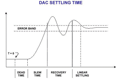 La risoluzione: essa rappresenta la variazione di tensione dovuta alla variazione di un LSB (Least Significant Bit) ovvero il bit meno significativo in un numero binario, ed in modo equivalente indica il valore minimo di tensione rappresentabile dal DAC.