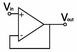 Buffer: questo dispositivo si ottiene chiudendo in retroazione unitaria un amplificatore operazionale ovvero riportando il segnale in uscita direttamente sull'ingresso invertente dell'amplificatore. Lo scopo principale del buffer è quello di separare o disaccoppiare la sorgente del segnale dal resto del circuito. Il disaccoppiamento consente di non assorbire corrente dalla sorgente di segnale, non provocando così i cosiddetti 'effetti di carico' (ovvero un eccessivo assorbimento di corrente dal generatore di segnale), e aumentare così la capacità di fornire potenza da parte del generatore.