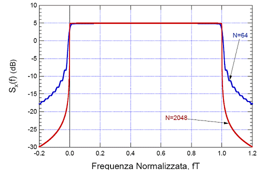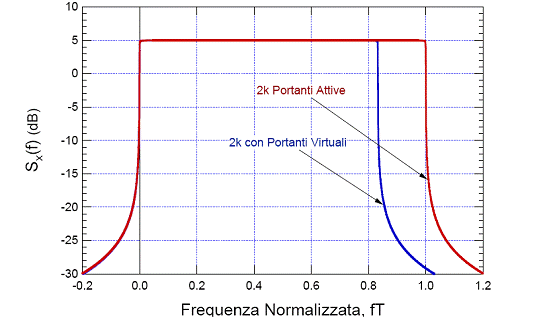 Lo spettro di potenza di un segnale OFDM con 64 e con 2048 portanti è rappresentato in Fig. 6, ove la scala della frequenza è normalizzata alla velocità di segnalazione di sorgente 1/T. Si nota che la sovrapposizione dei vari spettri elementari dei sottocanali dà luogo ad uno spettro estremamente piatto in banda e con un rapido decadimento verso lo 0, e che queste caratteristiche sono tanto più accentuate quanto più alto è il numero delle sottoportant Il segnale OFDM non è rigorosamente limitato in banda, ma l'occupazione spettrale, definita con i consueti criteri della banda a -20 o -40 dB, o della banda al 99% della potenza, è comunque di poco maggiore della banda di Nyquist 1/T e quindi l'efficienza spettrale della modulazione è elevata.
