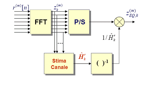 ove l' "uguale circa" tiene conto degli errori di stima della risposta del canale. Per la modalità con cui viene effettuata, questo tipo di compensazione delle distorsioni di canale è nota come "equalizzazione in frequenza" ed è tipica della modulazione OFDM o multiportante in generale.