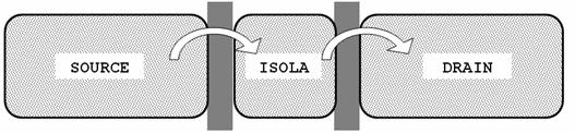 elettroni attraverso i gap isolanti tra il source e l'isola, e tra l'isola ed
