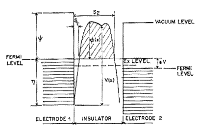 Quando due elettrodi sono separati da un isolante, perché si istauri l'equilibrio il limite superiore del gap di energia dell'isolante deve essere posto al di sopra del livello di Fermi dei due elettrodi: l'isolante quindi introduce una barriera di potenziale tra gli elettrodi che impedisce il passaggio di elettroni tra gli elettrodi.