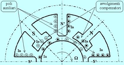 Vengono utilizzati per ridurre gli effetti negativi della reazione d'indotto. Consistono in conduttori inseriti in opportuni canali, paralleli alla generatrice del cilindro dell'indotto, ricavati nelle scarpe polari induttrici. Tali conduttori devono essere percorsi da una corrente continua con verso opposto ed intensità proporzionale a quella ( Ia ) che si ha nella via interna sottostante il polo. Tali avvolgimenti sono posti in serie alle spazzole e quindi sono percorsi dalla corrente ( I ) erogata al carico. Il campo magnetico da loro generato si oppone al campo d'indotto riducendone gli effetti negativi.