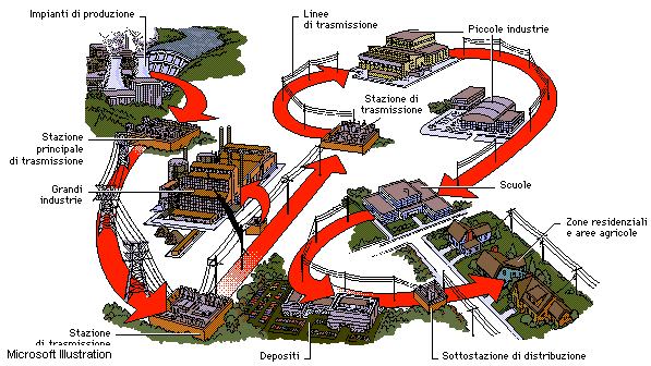 Sistemi per la trasformazione di altre forme di energia in energia elettrica, e per la trasmissione di questa nei luoghi di consumo. La produzione e la trasmissione di energia sotto forma di elettricità comportano importanti vantaggi economici in termini di costo per unità di potenza trasportata. (Vedi Motori e generatori elettrici). I sistemi elettrici di potenza rendono inoltre possibile l'utilizzo di energia idroelettrica lontano dai luoghi di produzione. Nei moderni sistemi di distribuzione si impiegano, generalmente, correnti alternate (AC), anche perché i livelli di tensione di questi segnali possono essere facilmente convertiti da alti a bassi valori, e viceversa, per mezzo di trasformatori. Così, ogni stadio del sistema può essere alimentato a livelli di tensione adeguati. Un sistema di produzione e di distribuzione di energia elettrica è costituito da sei elementi principali: la centrale di produzione; un gruppo di trasformazione che porta l'energia generata a livelli di alta tensione vantaggiosi per le linee di trasmissione; le linee stesse; le sottostazioni di trasformazione che riducono le tensioni per le linee locali; le linee locali di distribuzione; le cabine di trasformazione che riducono ulteriormente le tensioni fino ai livelli di impiego delle apparecchiature degli utenti.