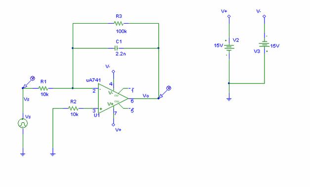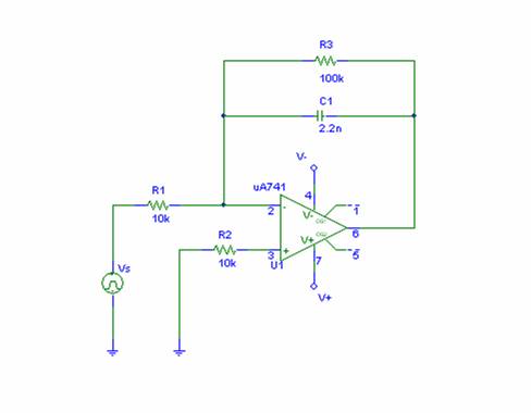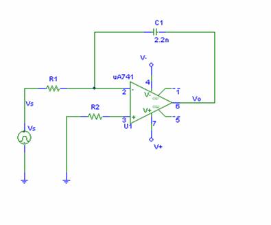 Questo č un circuito base di un integratore ed č costituito da una capacitą (C1) posta tra la tensione di uscita Vo e il piedino invertente dell'operazionale e da una semplice resistenza.
