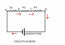 Resistori in serie. In un circuito, quando i resistori sono posti una di seguito all'altro, vengono detti in serie. Come si vede nella figura, la corrente che percorre R1 deve percorrere anche R2 e R3. E' abbastanza facile da prevedere che più resistori in serie si comportino come un unico resistore la cui resistenza sia data dalla somma delle singole resistenze. Visto che la corrente si muove dal punto con potenziale più alto a quello con potenziale più basso, questa passerà prima per R1, poi per R2 e poi per R3. Per cui passato ogni resistore la tensione si abbasserà progressivamente. Dunque secondo la legge di Ohm: