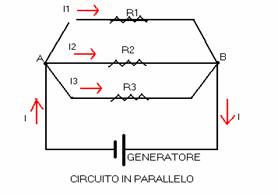 da scirvere vicino alla figura sopra: La corrente di intensità I che giunge all'estremo A dei tre resistori collegati in parallelo si divide in tre correnti di intensità I1, I2, I3, tali che I = I1 + I2 + I3.
